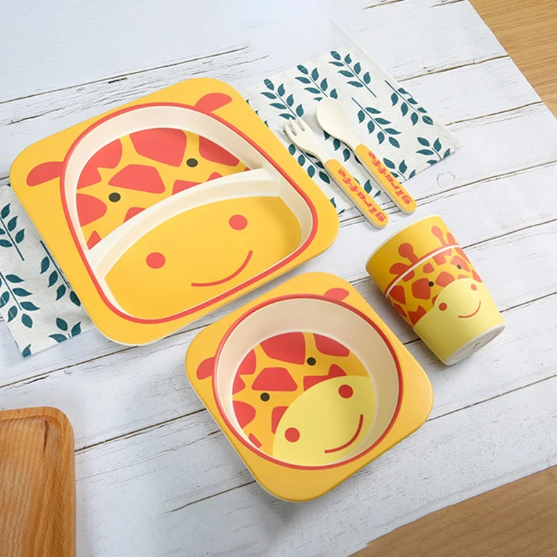 HIGH QUALITY 5 Pcs Cartoon Bamboo Fiber Portable Children'S Cutlery Set Baby Feeding Cutlery Kids Dinnerware Set